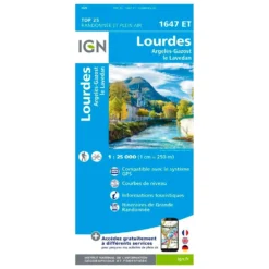 Explorez Lourdes, Argelès-Gazost, le Lavedan avec la carte de randonnée IGN 1647ET . Cette carte très précise vous offre tous les détails du terrain, des voies de communication aux sentiers, en passant par les constructions et les arbres isolés. Vous trouverez également des informations touristiques et des sentiers balisés pour vous guider.